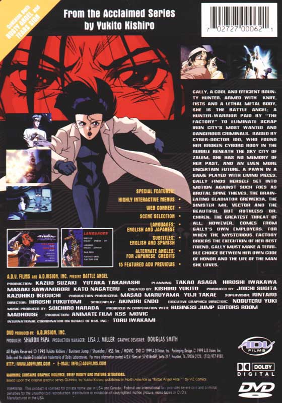 All Rigths Reserved © 1993 Yukito Kishiro / Business Jump / Shueisha / KSS, Inc / MOVIC, DVD © 1999 AD VISION 1998 LOS NOMBRES, MARCAS, PERSONAJES Y TODO LO RELACIONADO CON ELLOS SON PROPIEDAD DE SUS RESPECTIVOS AUTORES Y SOLO HAN SIDO REPRODUCIDOS EN ESTA PAGINA CON FINES INFORMATIVOS.
