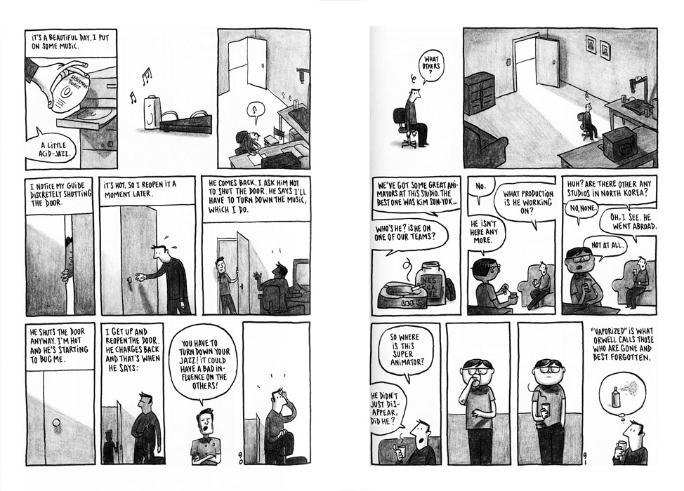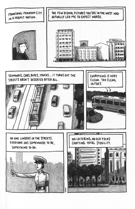 Enviado por sus jefes franceses a supervisar la maquila de un proyecto de animación, Guy Delisle, narra su estadía en Pyongyang, capital de Corea del Norte, a partir de que llega al aeropuerto en donde conoce a su guía quien lo acompañara en todo momento en lugares publicos, su primera visita aún antes de llegar a su hotel y no por que él así lo haya decidido es ir al punto más alto de la ciudad donde se encuentra una monumental estatua de Kim Il-Sung fundador y padre de la nación, declarado presidente perpetuo de Corea del Norte por mandato constitucional, es decir que aunque murio en 1994 sigue siendo presidente, ¿que tal?, este sera el inicio, de muchas de las vivencias que tendra durante los dos meses que estara en ese país, hospedado en un hotel reservado para extranjeros que dificilmente llenan un piso de todo el edificio, en el estudio de animación se le asignara un interprete que lo ayudara a comunicarse con la gente a quienes viene a supervisar, aprenderemos que ningun extranjero puede tomar un taxi si no va acompañado de su guía y que ningún koreano puede tomar un taxi despues de las 10 de la noche si no va acompañado de un extranjero, que durante la noche se apagan todas las luces de la ciudad y lo único que brilla en esa oscuridad es la llama de un monumento erigido en honor del padre fundador por su hijo, Kim Jong-Il, que actualmente es quien gobierna este país , una dinastia comunista, durante su tiempo de descanso convivirá con otros extranjeros en la sede de las naciones unidas , uno de los pocos lugares donde puede estar sin chaperones en una aséptica ciudad regida por las omnipresentes imagenes del fundador y su vastago, en donde no hay minusvalidos o mejor dicho personas con capacidades diferentes ya que todos los norcoreanos nacen todos sanos y fuertes, donde muchas personas son "voluntarias" en las tareas de limpieza y mantenimiento de la ciudad, donde las novedades en el menu de los restaurantes estan regidas por alguna conferencia o reunión internacional que se lleve a cabo , tal vez todo esto parezca un poco triste y pesismista y lo es pero Delisle narra todas sus experiencias de una manera amena y divertida que nos permite atizbar aunque sea un poco la vida cotidiana de los extranjeros y los nacionales en este cerrado pais