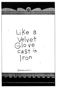 Esta página fue terminada el 4 de septiembre del 2005 LIKE A VELVET GLOVE CAST IN IRON © 1989, 1990, 1991, 1992, 1993 Daniel G. Clowes. Publicado por Groth and Thompson. Editado por Fantagraphics Books. All Rights Reserved. ISBN (softcover) 1-56097 -116 -9 LOS NOMBRES, MARCAS, PERSONAJES Y TODO LO RELACIONADO CON ELLOS SON PROPIEDAD DE SUS RESPECTIVOS AUTORES Y SOLO HAN SIDO REPRODUCIDOS EN ESTA PAGINA CON FINES INFORMATIVOS. ESO SI REPRODUCIDOS SIN PERMISO YA QUE SE SUPONE DEBERIA HABERLE PEDIDO PERMISO POR ESCRITO A FANTAGRAPHICS. |