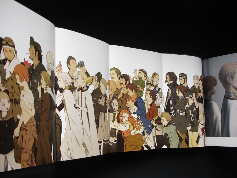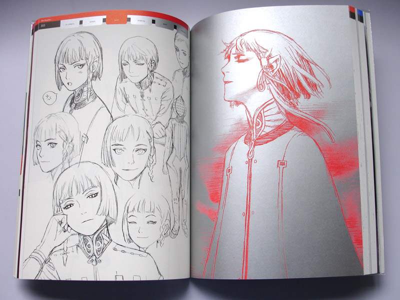 El libro que ahora nos ocupa, Prismstone, esta separado en tres capítulos y abarca su trabajo en el campo del anime con estudio Gonzo de 1998 al 2006 en los títulos Submarine No. 6, Last Exile y Mardock Scramble, este último fue un proyecto de OVAs basado en una serie de novelas que nunca vio la luz y que en ultimas fechas se anuncio nuevamente como una serie de tres películas con otro estudio de animación y sin el diseño de personajes que había realizado Murata, al ser un proyecto trunco la extensión de este capitulo en el libro es muy corta, tan solo 30 páginas pero muy bien aprovechadas. La sección dedicada a Blue Submarine No.6 tiene 80 paginas lo que nos deja poco menos de 200 paginas para Last Exile. En el libro encontraremos estudios de personajes desde su concepción hasta la versión definitiva, diseño mecánico y de vestuario, bocetos para portadas e ilustraciones promocionales, realizados con técnicas y estilos muy diversos, si te gusta ver el proceso creativo y la evolución de un diseño seguramente gustaras mucho de este libro cuyo contenido general esta en blanco y negro pero que también trae una treintena de páginas a color, algunas de ellas desplegables en dos, tres o hasta cuatro hojas.La edición es muy buena, la portada es plateada y tiene un forro de vinyl transparente con rayas horizontales, el plateado también esta presente en el interior para marcar los títulos y como fondo para algunas de las ilustraciones lo que le da cierto toque especial, en general un buen libro para todo aficionado a Range Murata, el diseño de personajes o a la ilustración en general.