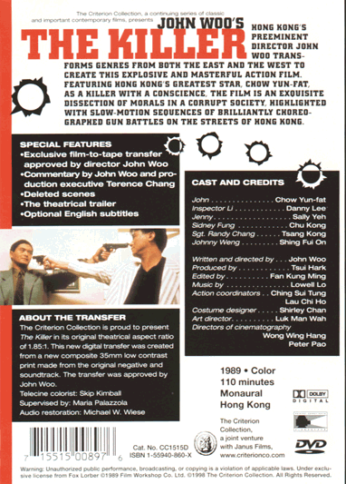 FICHA DVD DVD VIDEO COMPAÑIA The Criterion Collection LENGUAJES Chino SUBTITULOS Ingles AUDIO Dolby Digital - Monoaural CARACTERISTICAS EXTRAS Transfer Film-Video aprobado por John Woo Comentarios por John Woo y Terence Chang (INGLES) Escenas Borradas Theatrical Trailer